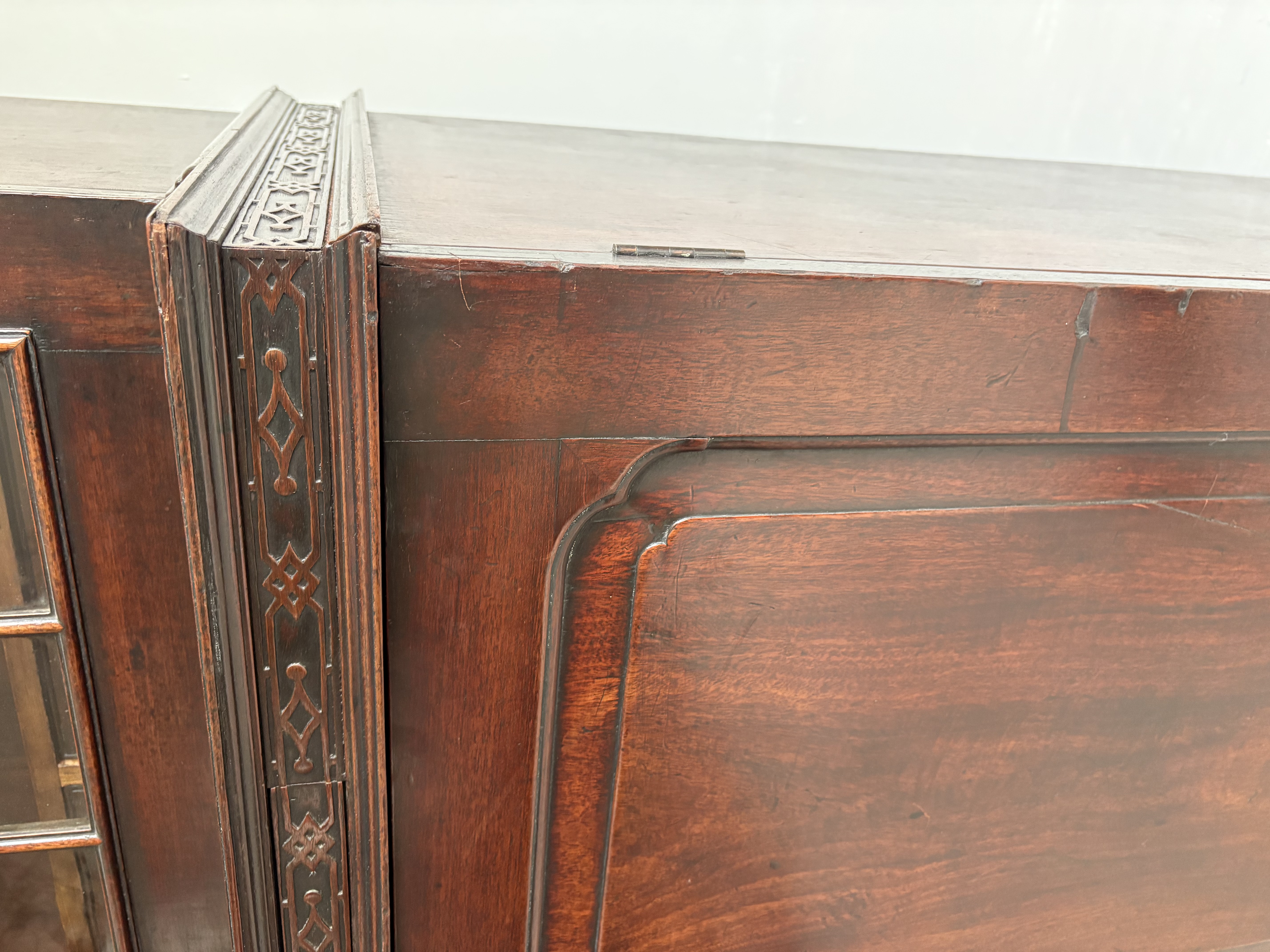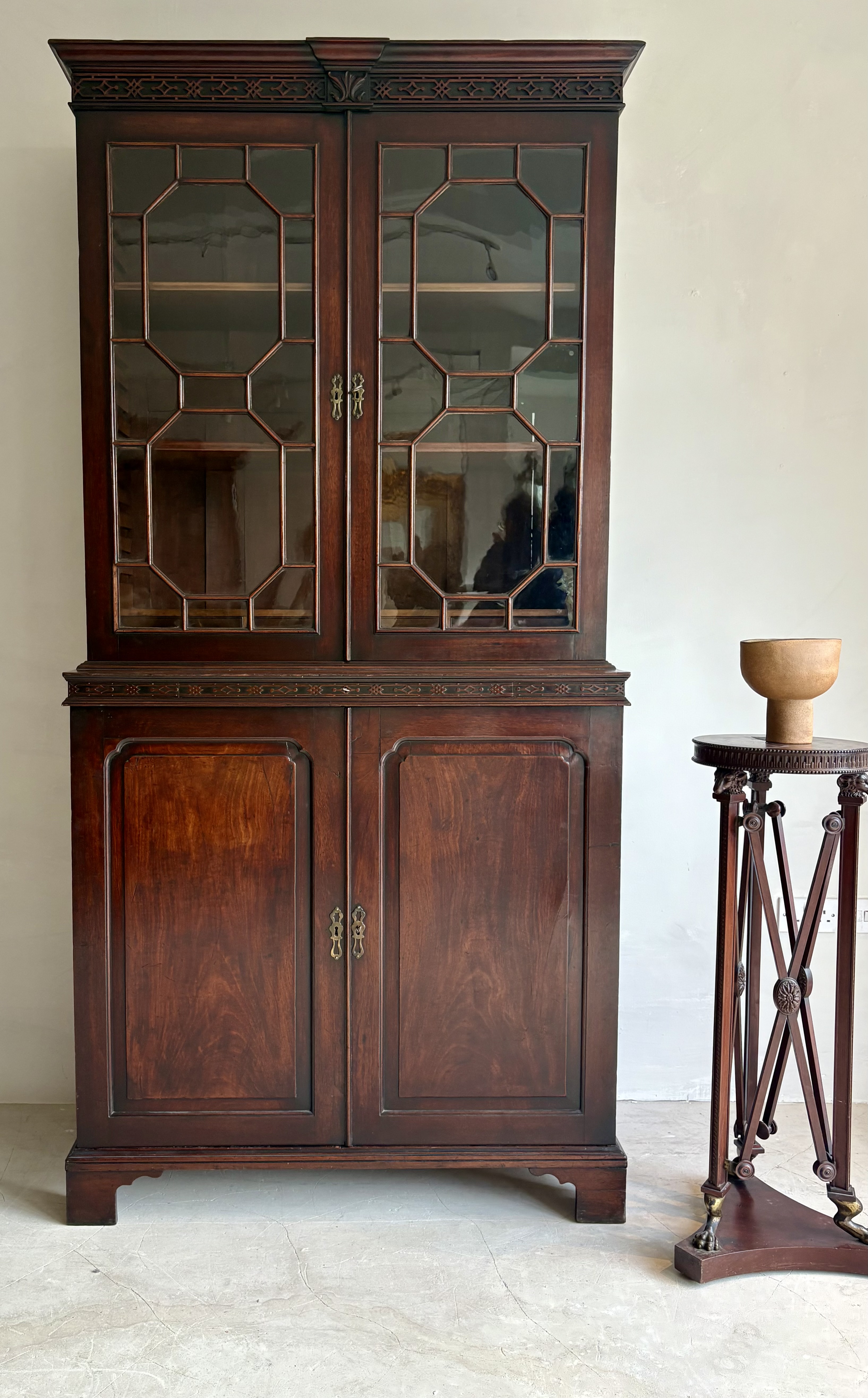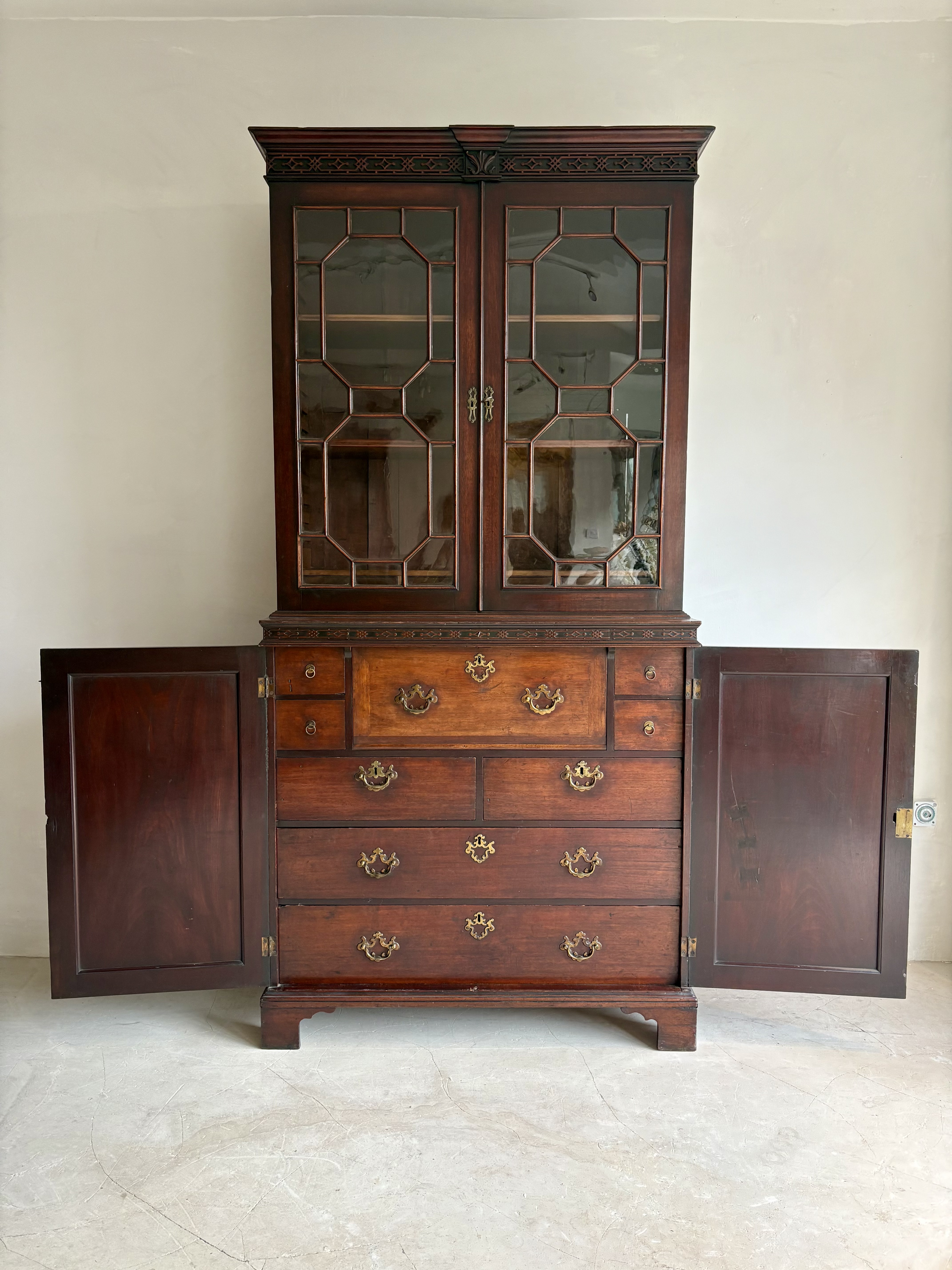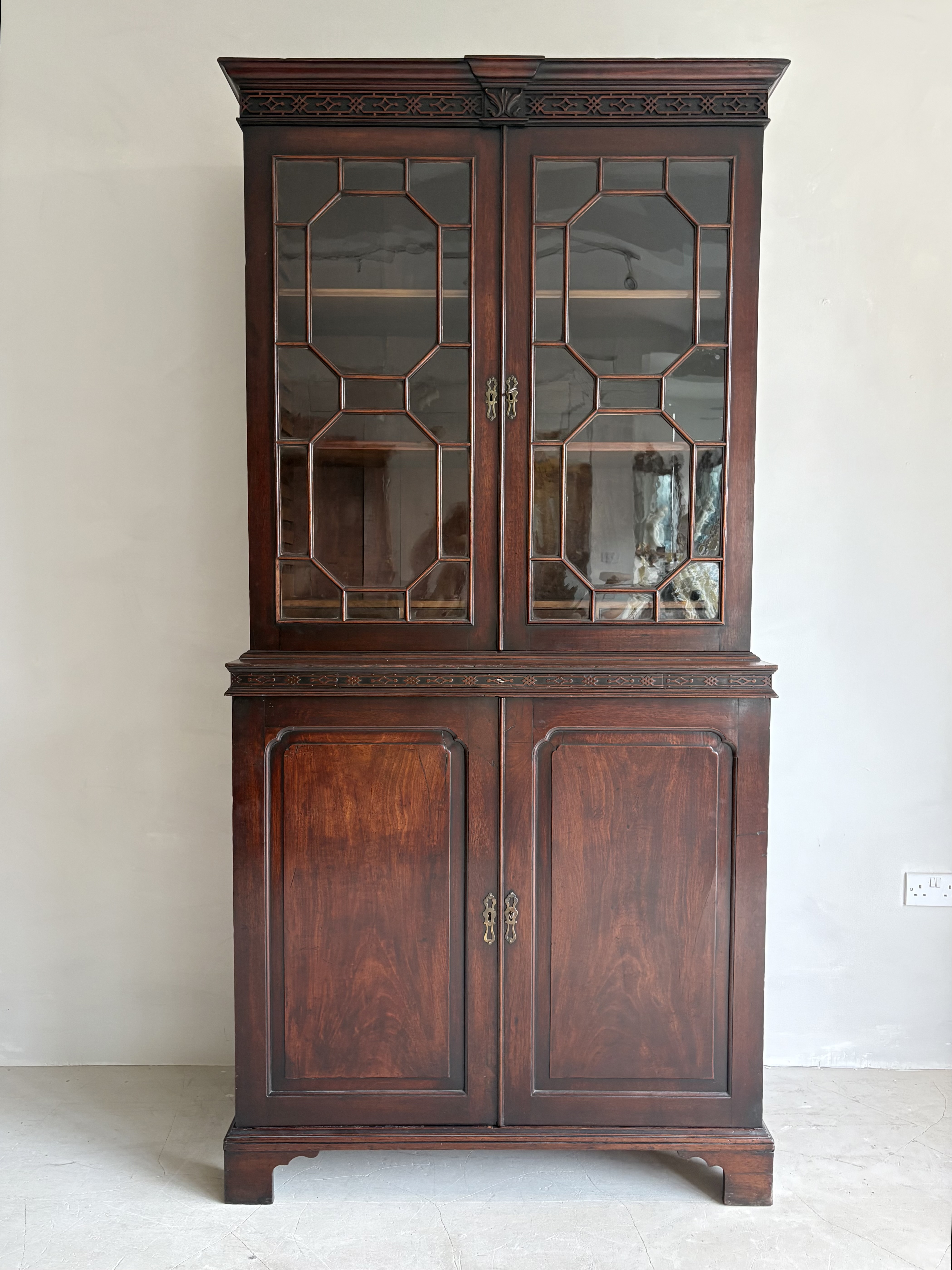 A Georgian mahogany Chippendale bookcase with Astrical glazing,a panelled back breakfronted with Chinese Chippendale blind fret work with centrally carved motive. Blind fretwork concealed waist drawer below glazed doors.