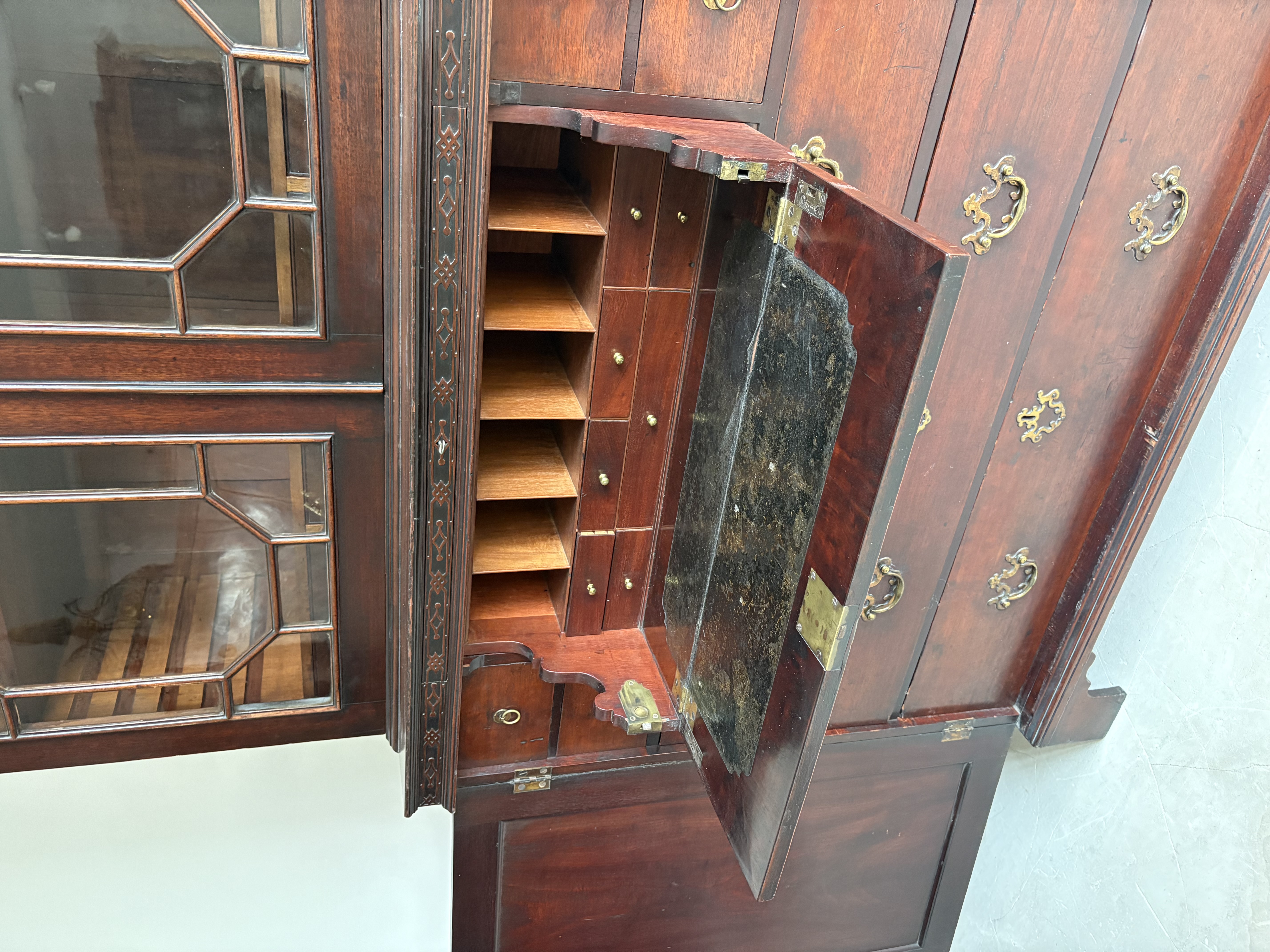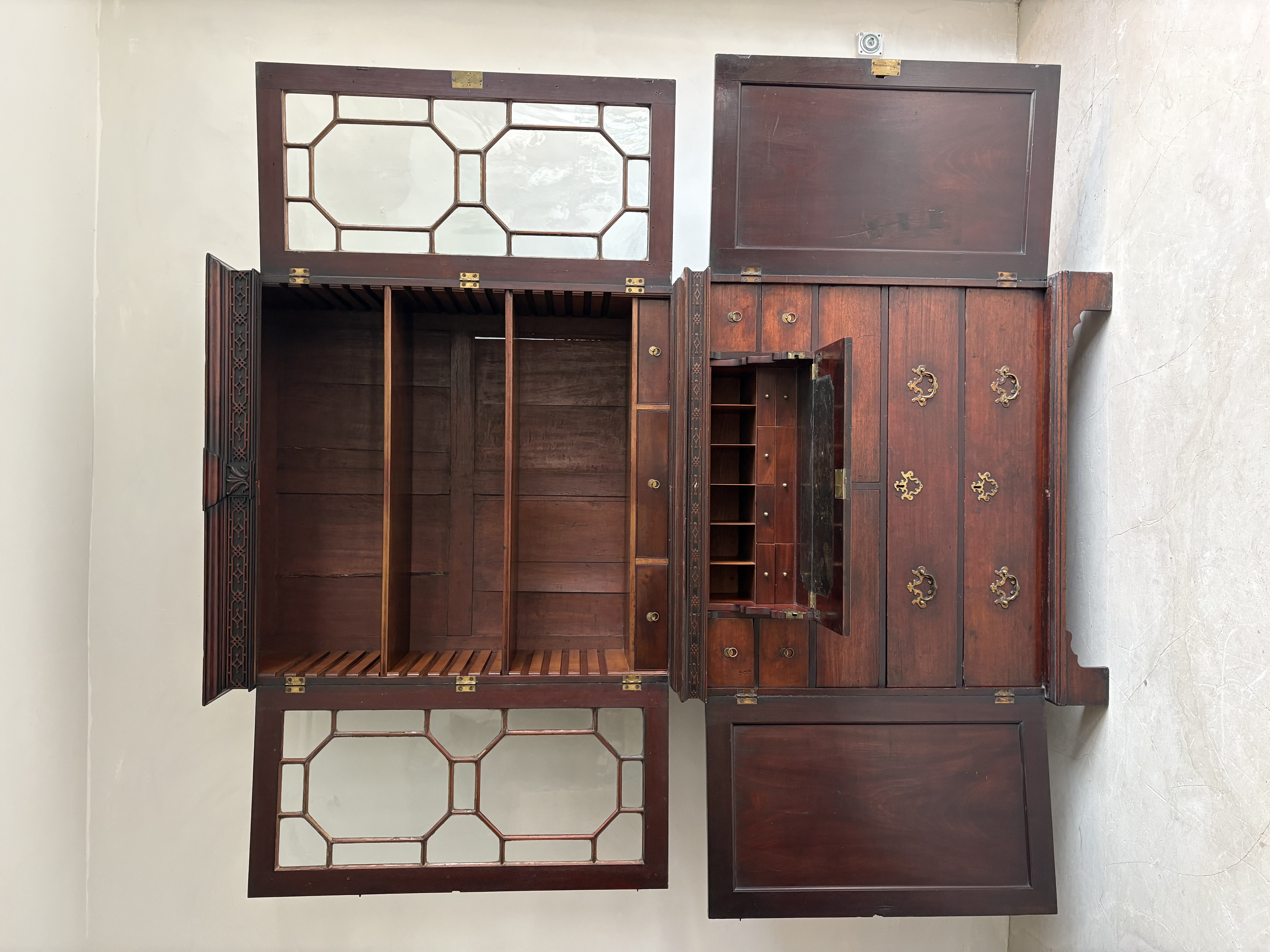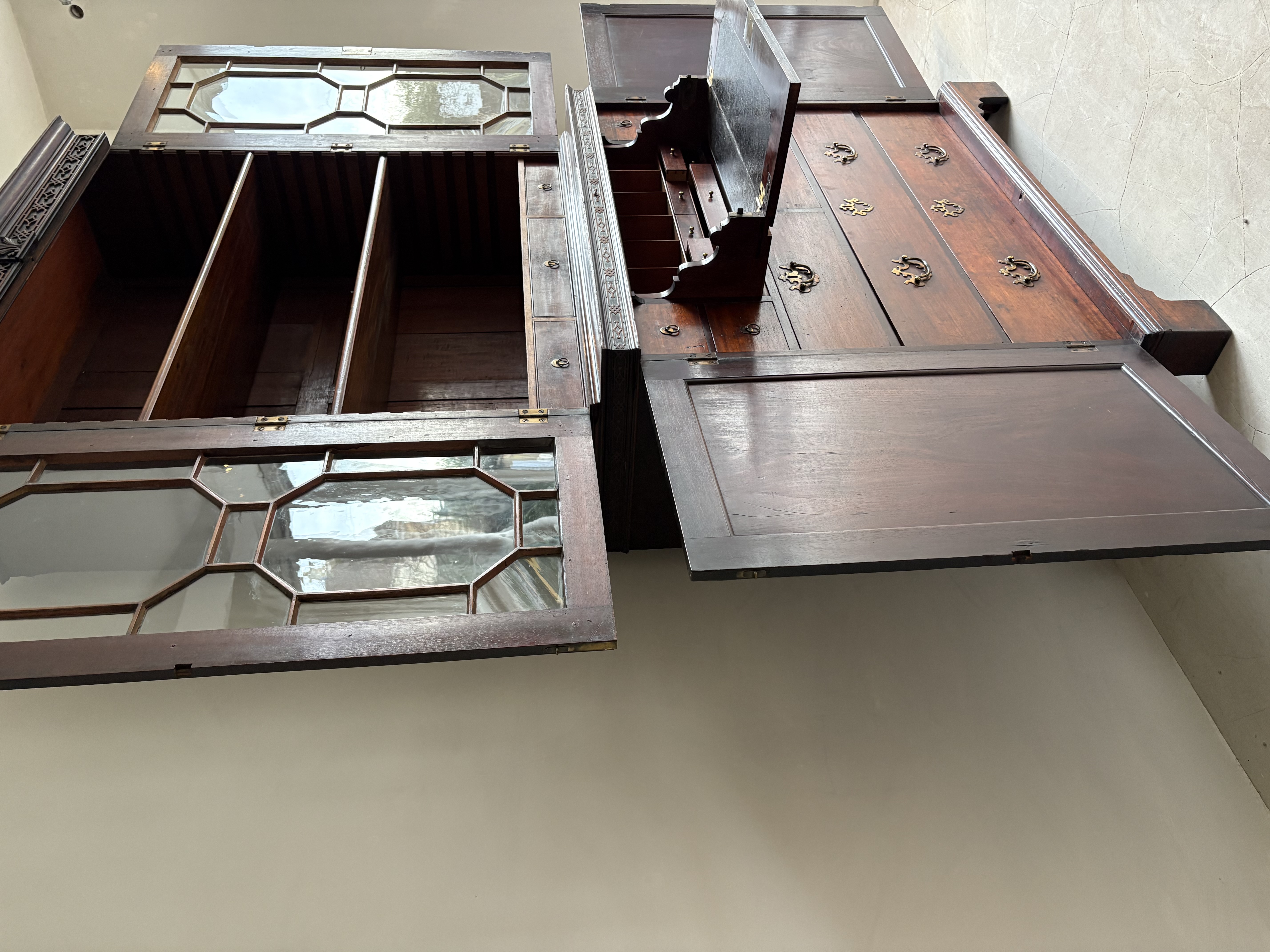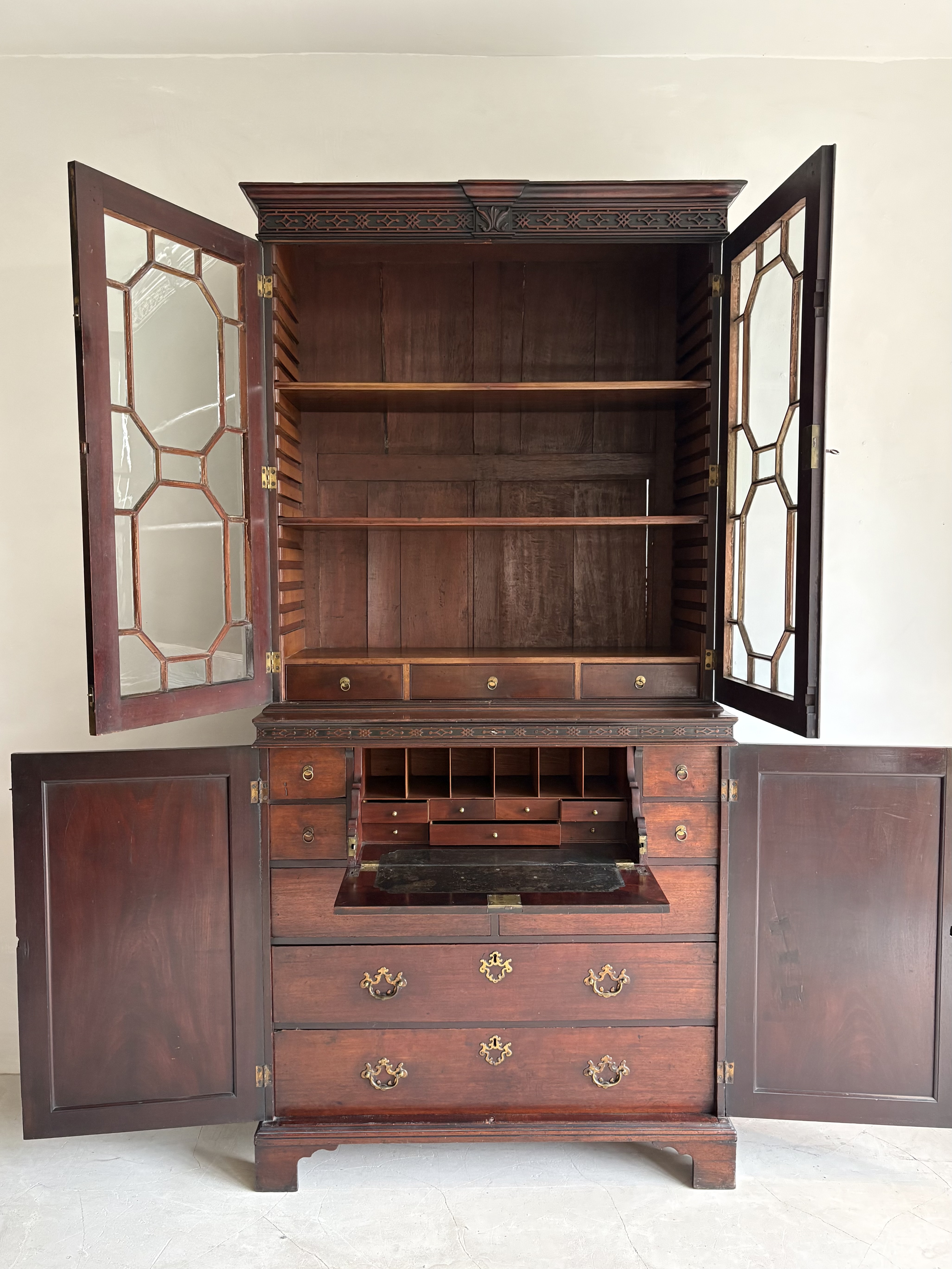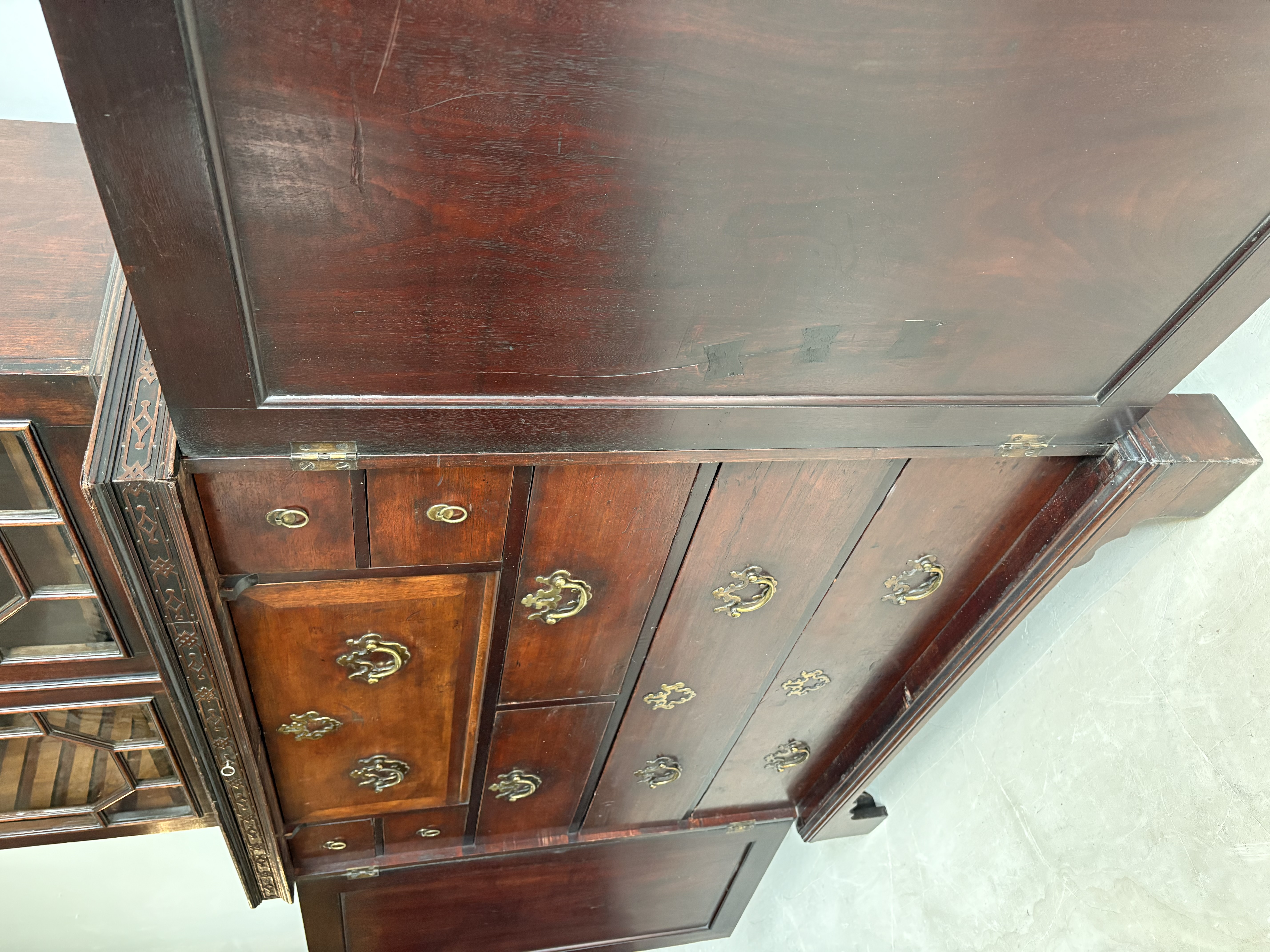 A Georgian mahogany Chippendale bookcase with Astrical glazing,a panelled back breakfronted with Chinese Chippendale blind fret work with centrally carved motive. Blind fretwork concealed waist drawer below glazed doors.