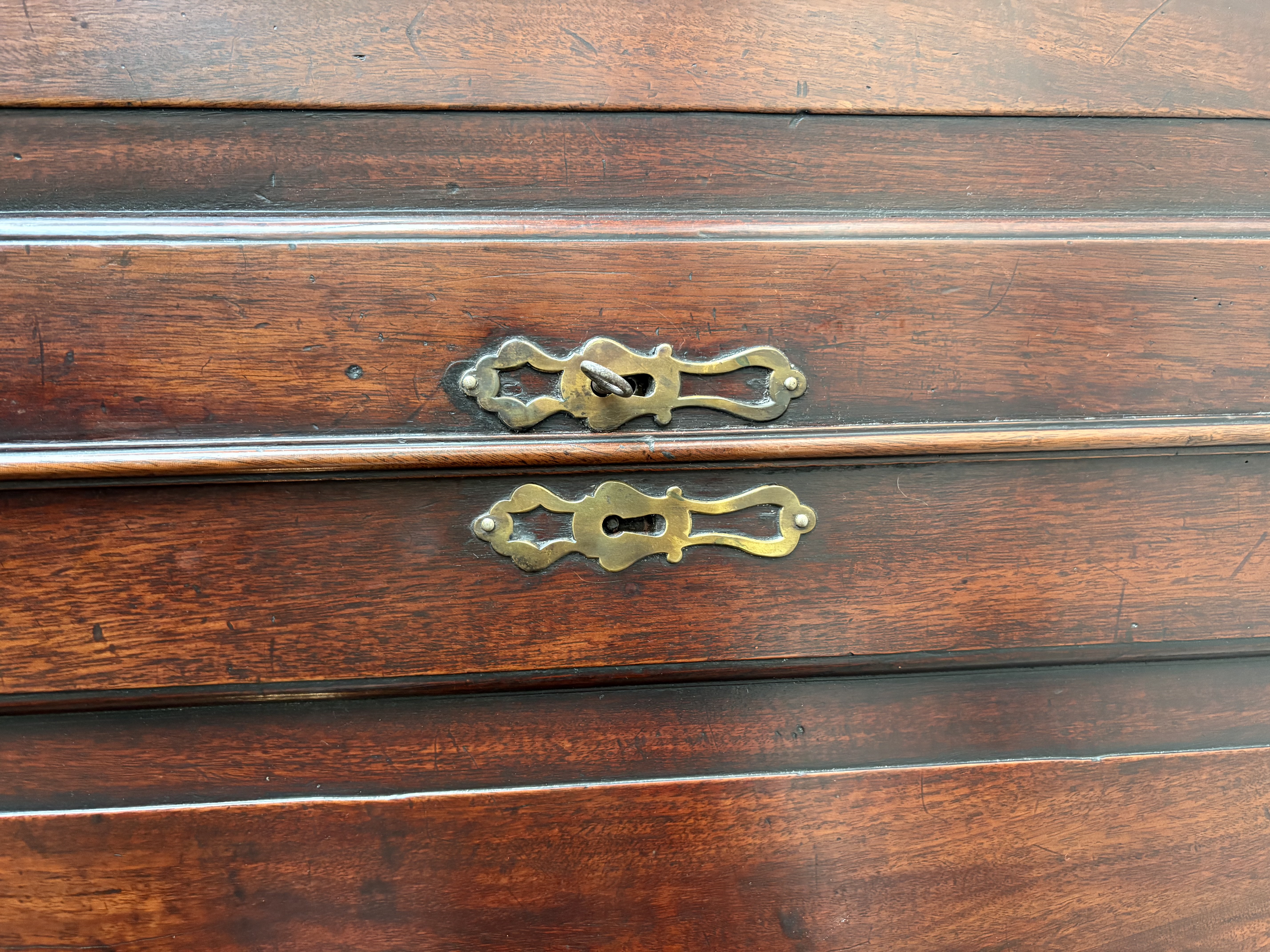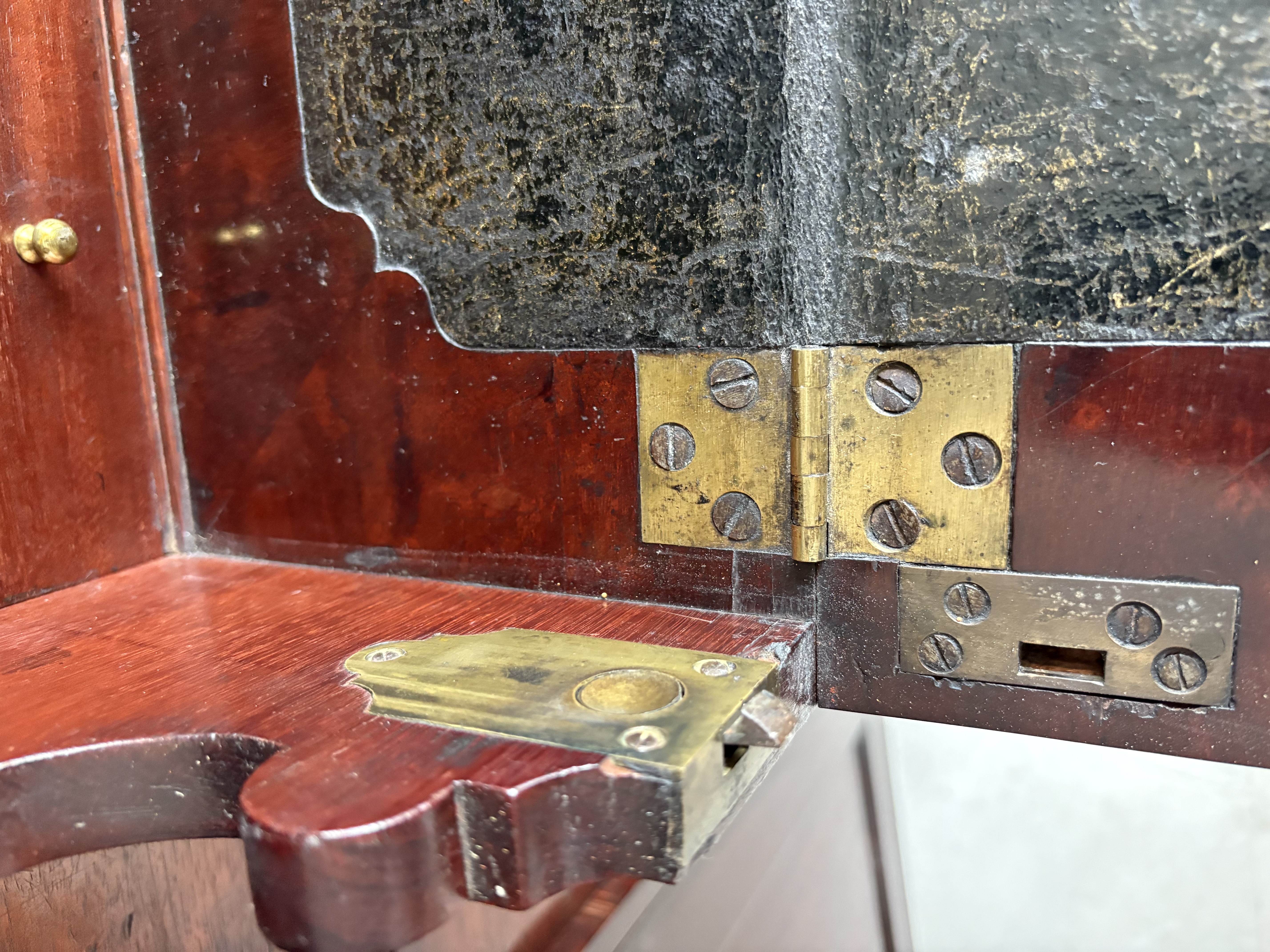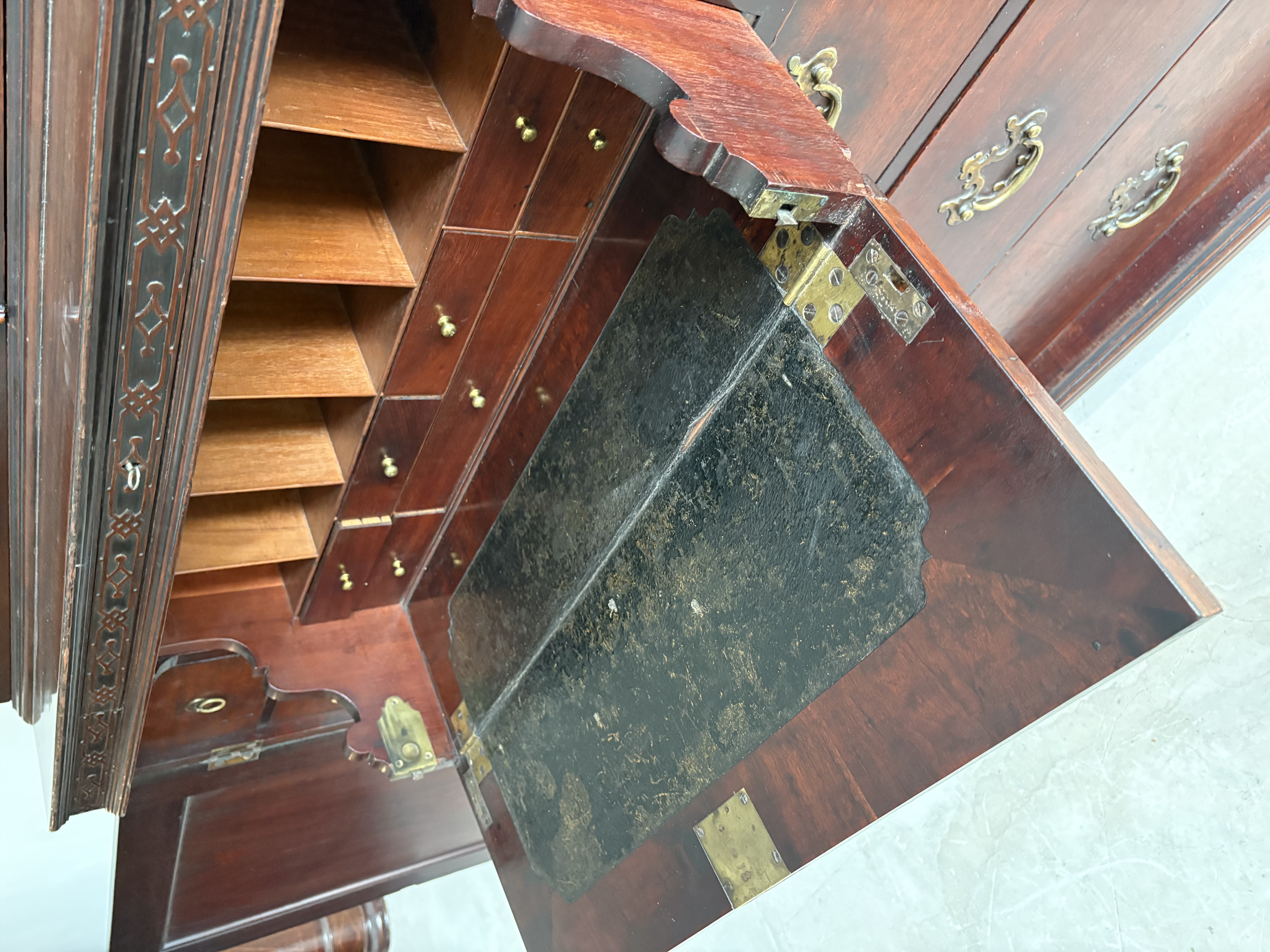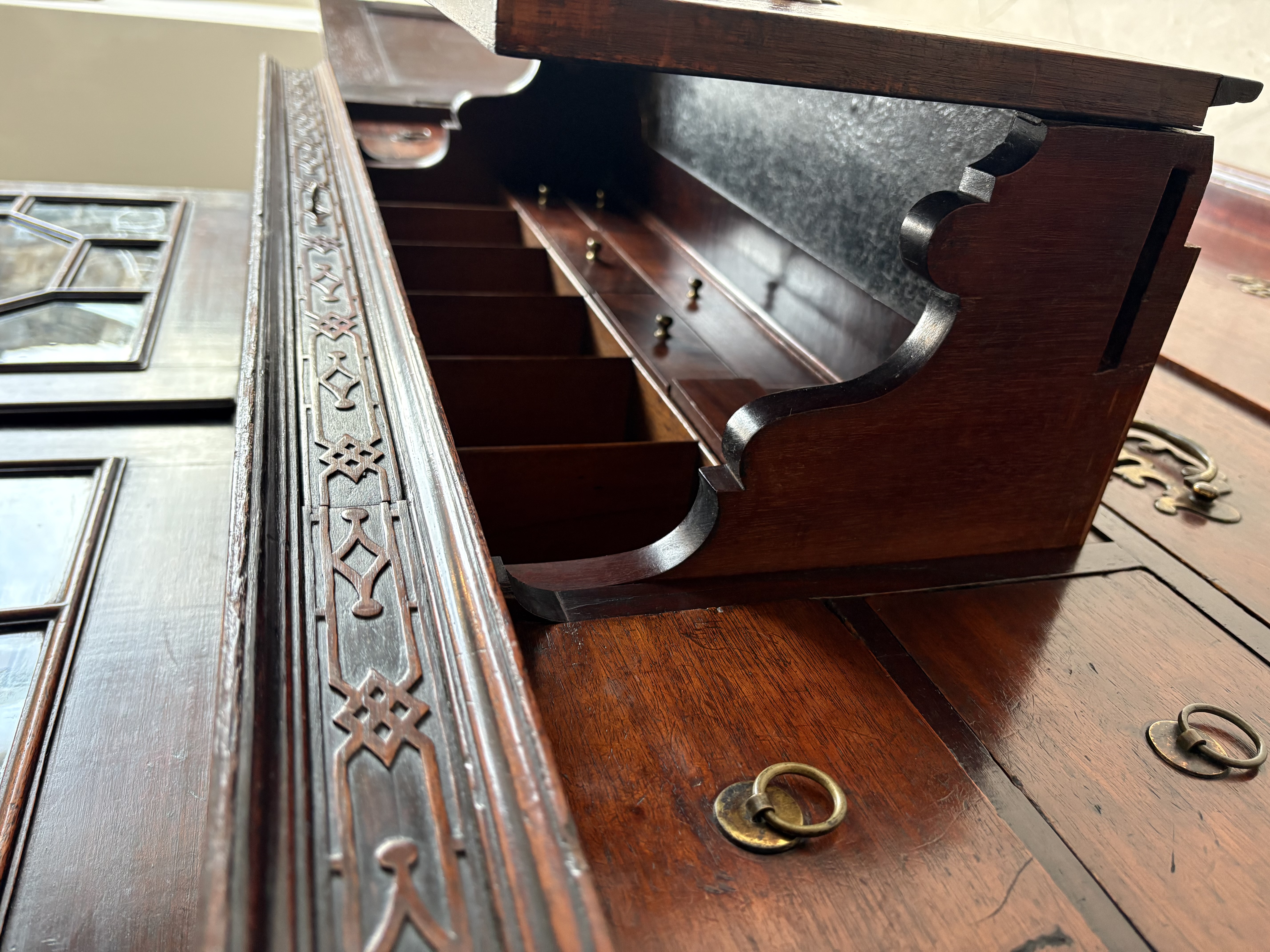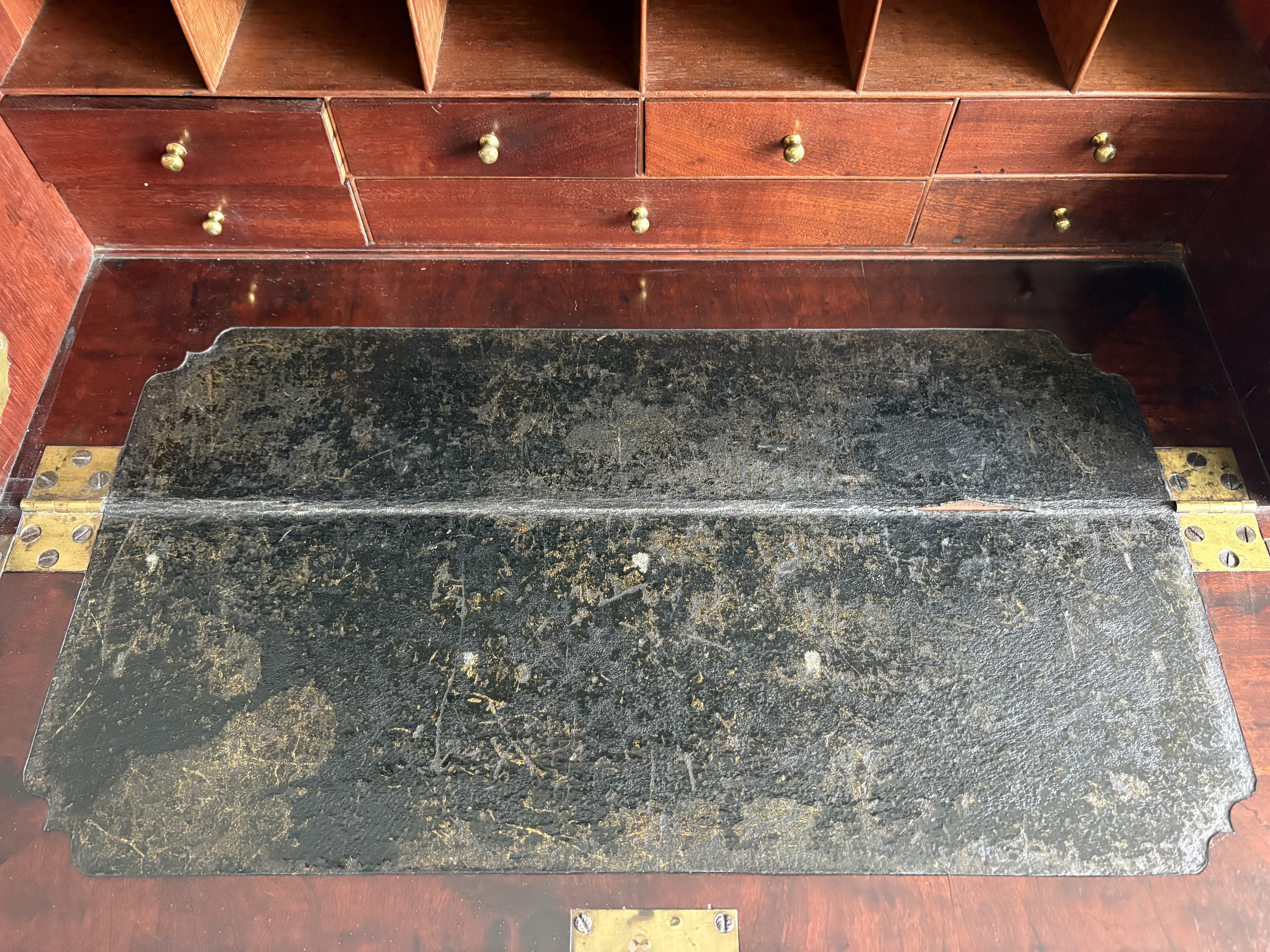 Interior arrangement of drawers all with original handles and a central secretaire with original black leather.,writing drawers and pigeonholes above.