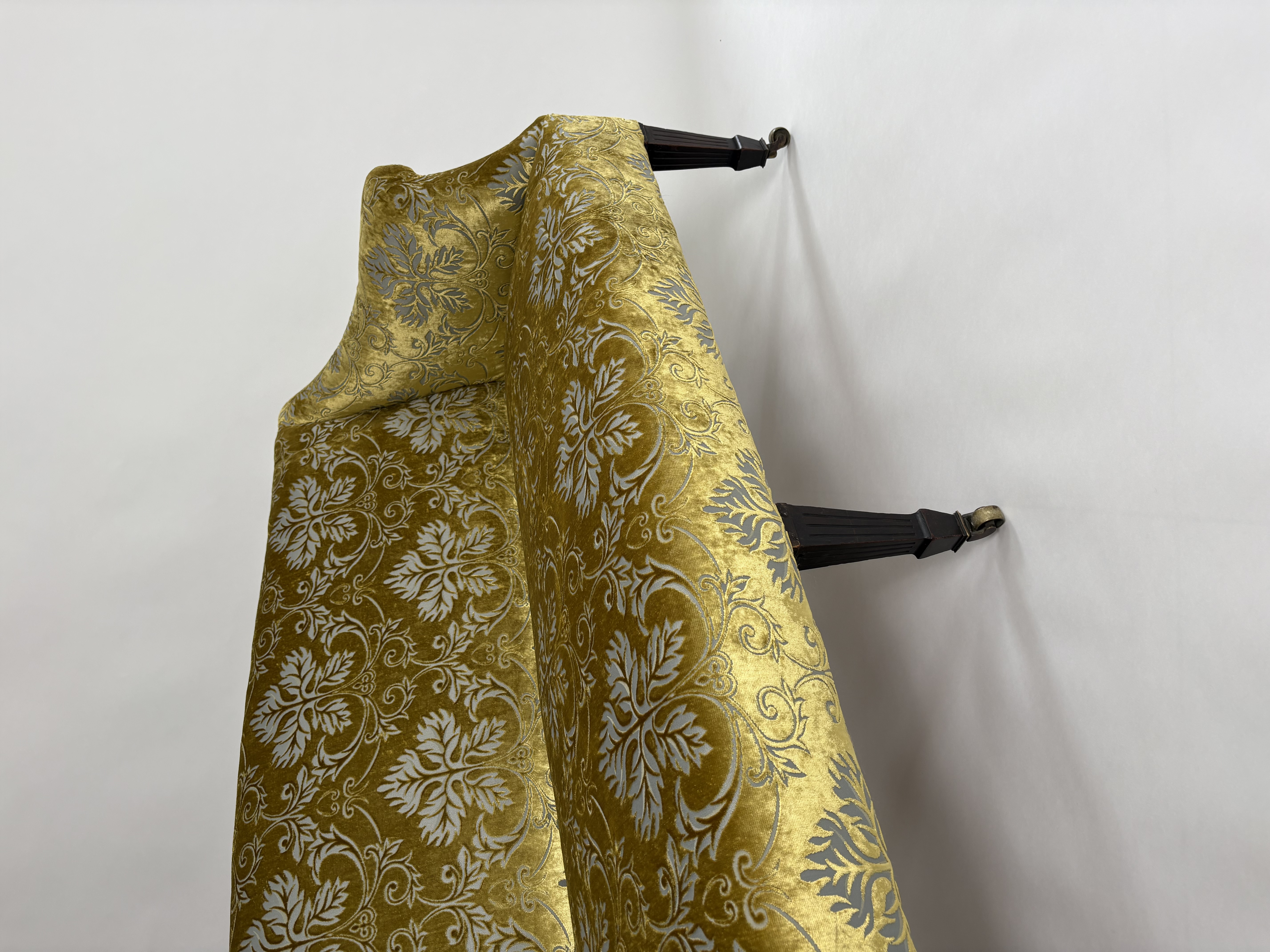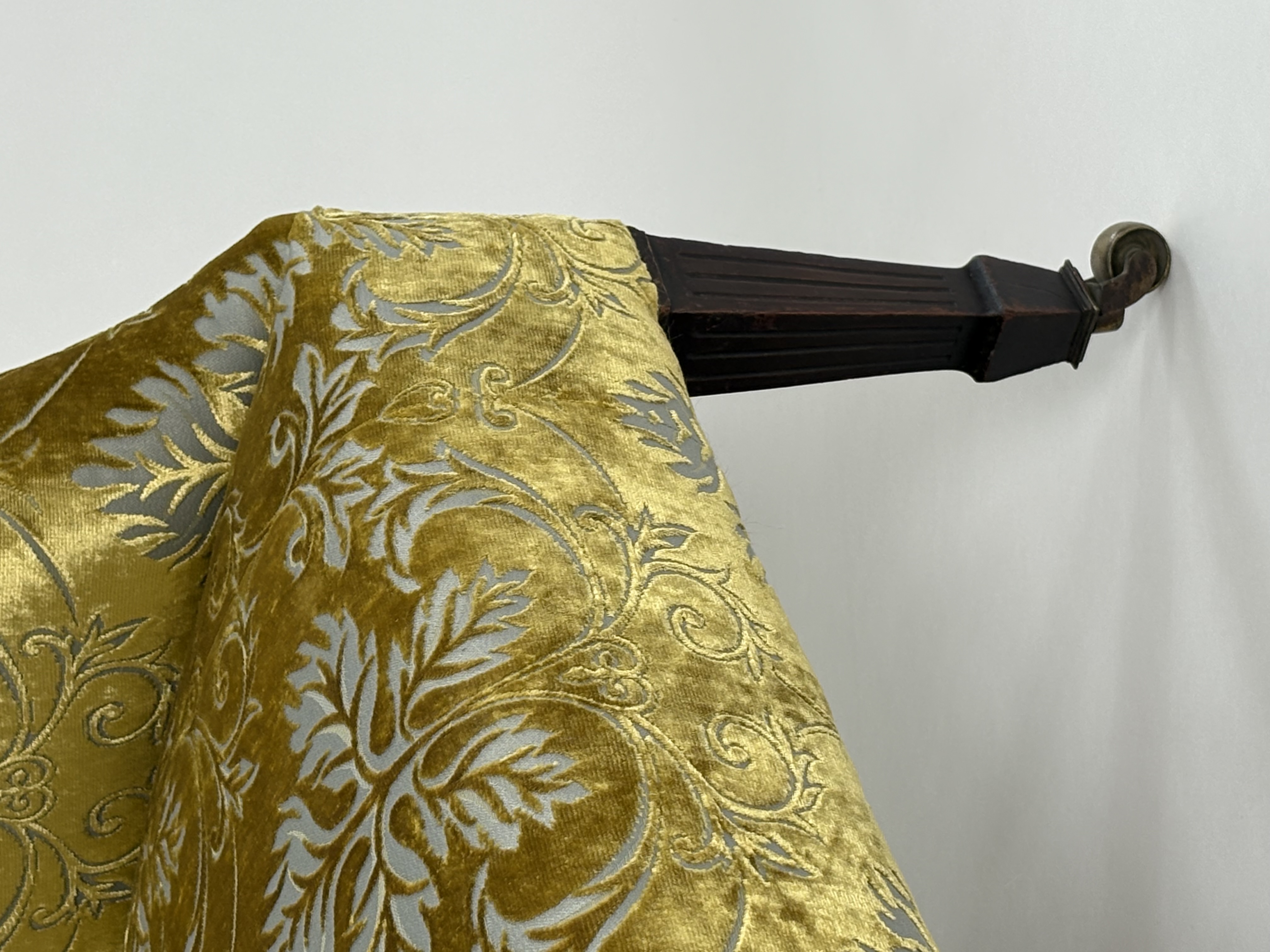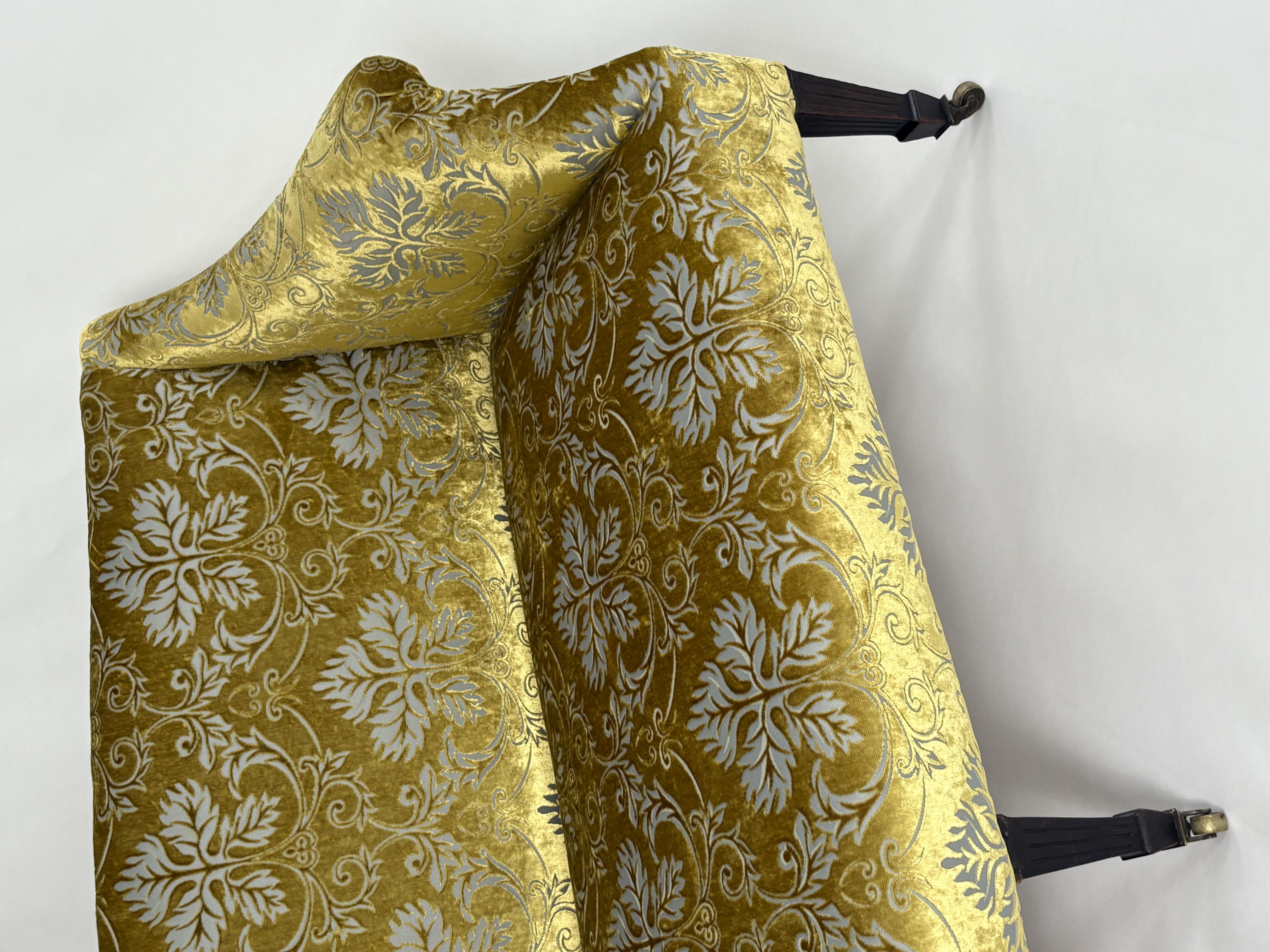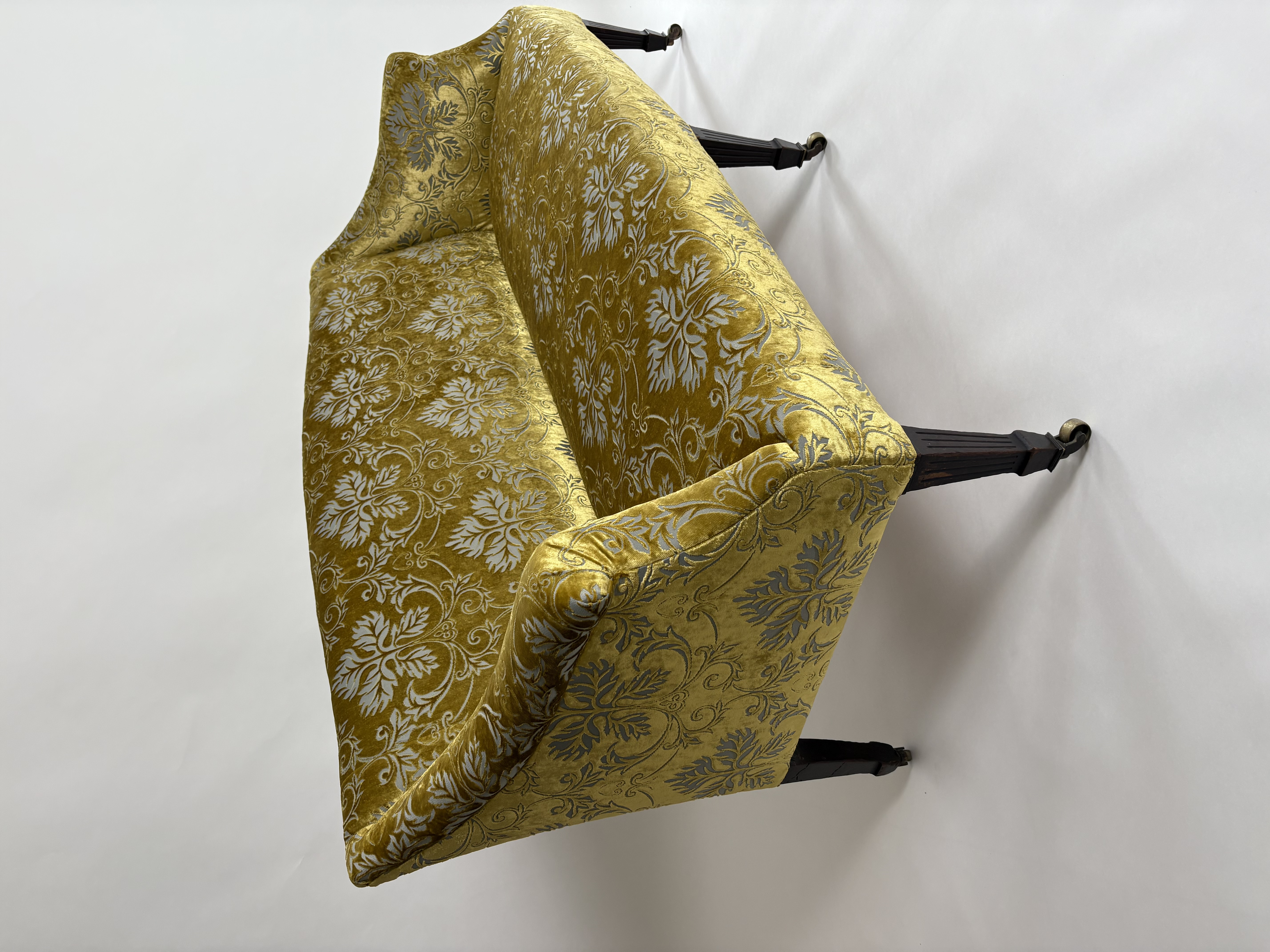 A good English Regency mahogany settee. On6 tapering square legs with original brass castors.The back with kicking out legs ,strong ,narrow armrests with scroll ends, which are flat fronted forward sloping towards the front edge of the settee.